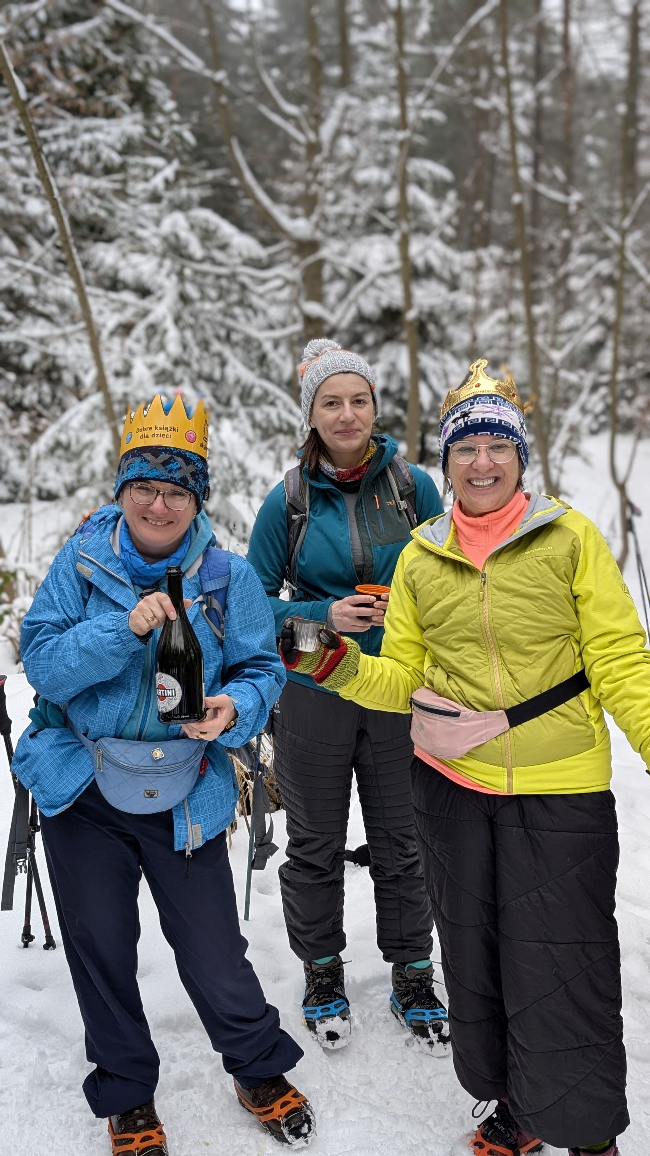 Tym razem celem poniedziałkowego wyjazdu prowadzonego przez Stefana był Beskid Sądecki. Czarny Potok, gdzie startowaliśmy przywitał nas dużym zachmurzeniem i otaczającą ze wszystkich stron białą, śnieżną zimą. Zaraz na początku wędrówki czekała nas jeszcze mała uroczystość. Na Przełęczy Krzyżowej świętowaliśmy trzecie urodziny Nowohuckiego Oddziału PTTK i Klubu Turystyki Górskiej "Nowy Wierch". Były pyszne ciasta i napoje bąbelkowe, oraz mnóstwo radości i gromkie sto lat odśpiewane przez grupę.